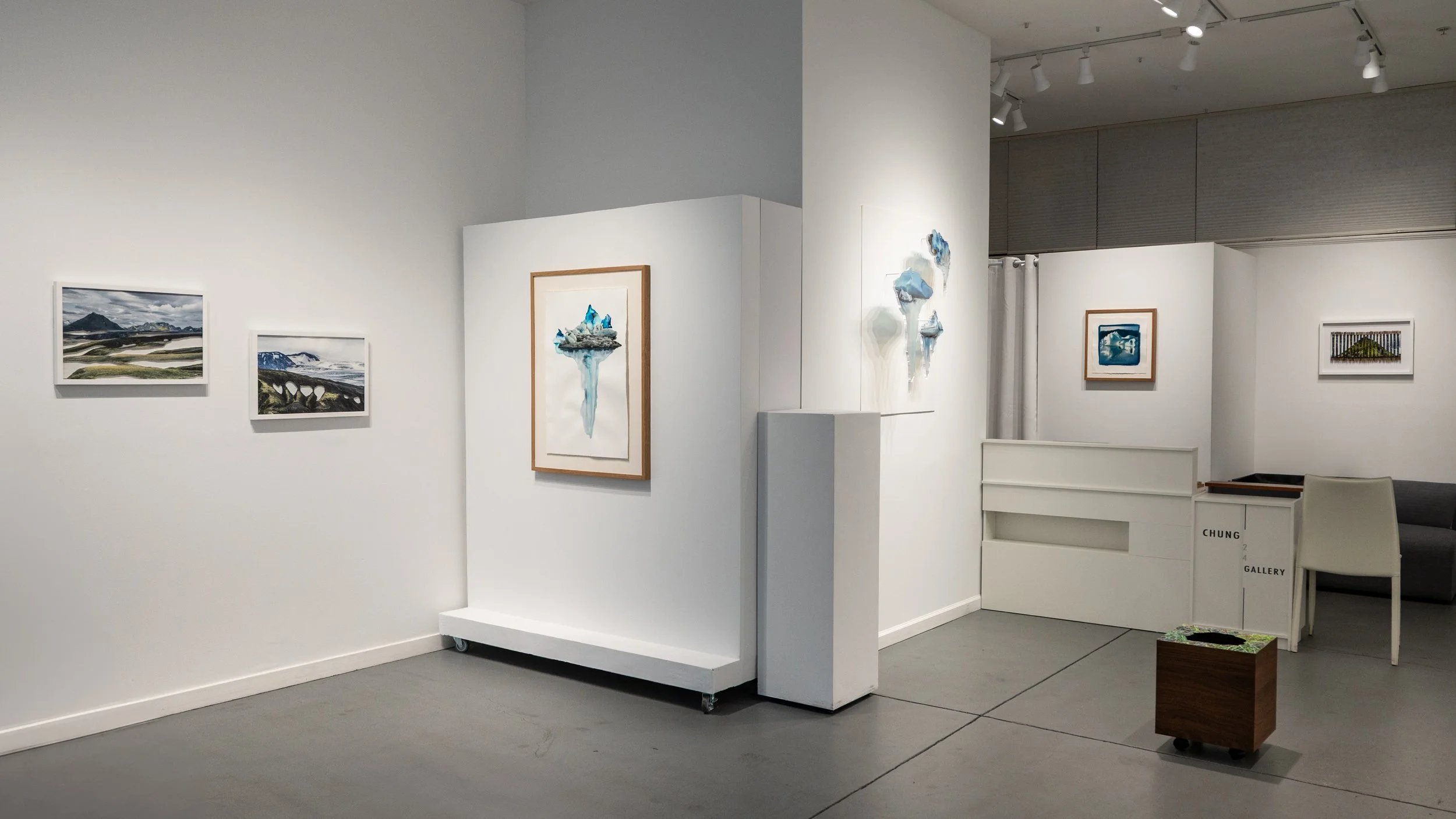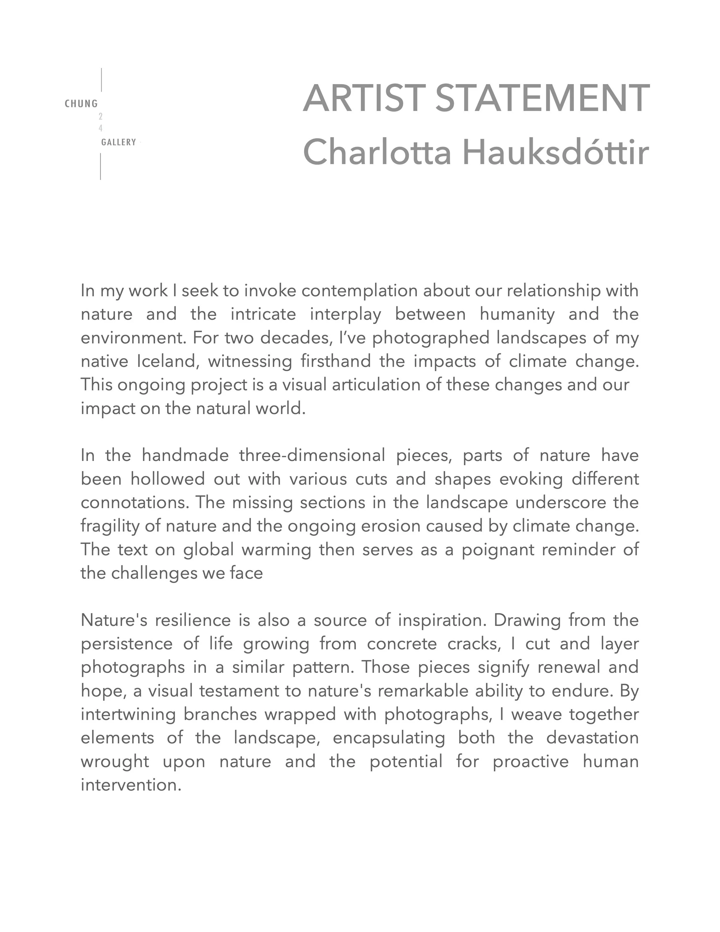 The idea that all things are inter-related from a macro to a micro level sets the tone amongst work by artists Barbara Boissevain and Charlotta Hauksdóttir in this exhibition As Above, So Below. Each artist's representation of the erasure and erosion of Icelandic landscape with use of photography-based mixed media highlights the consequences of climate change in the context of ecological cycles.