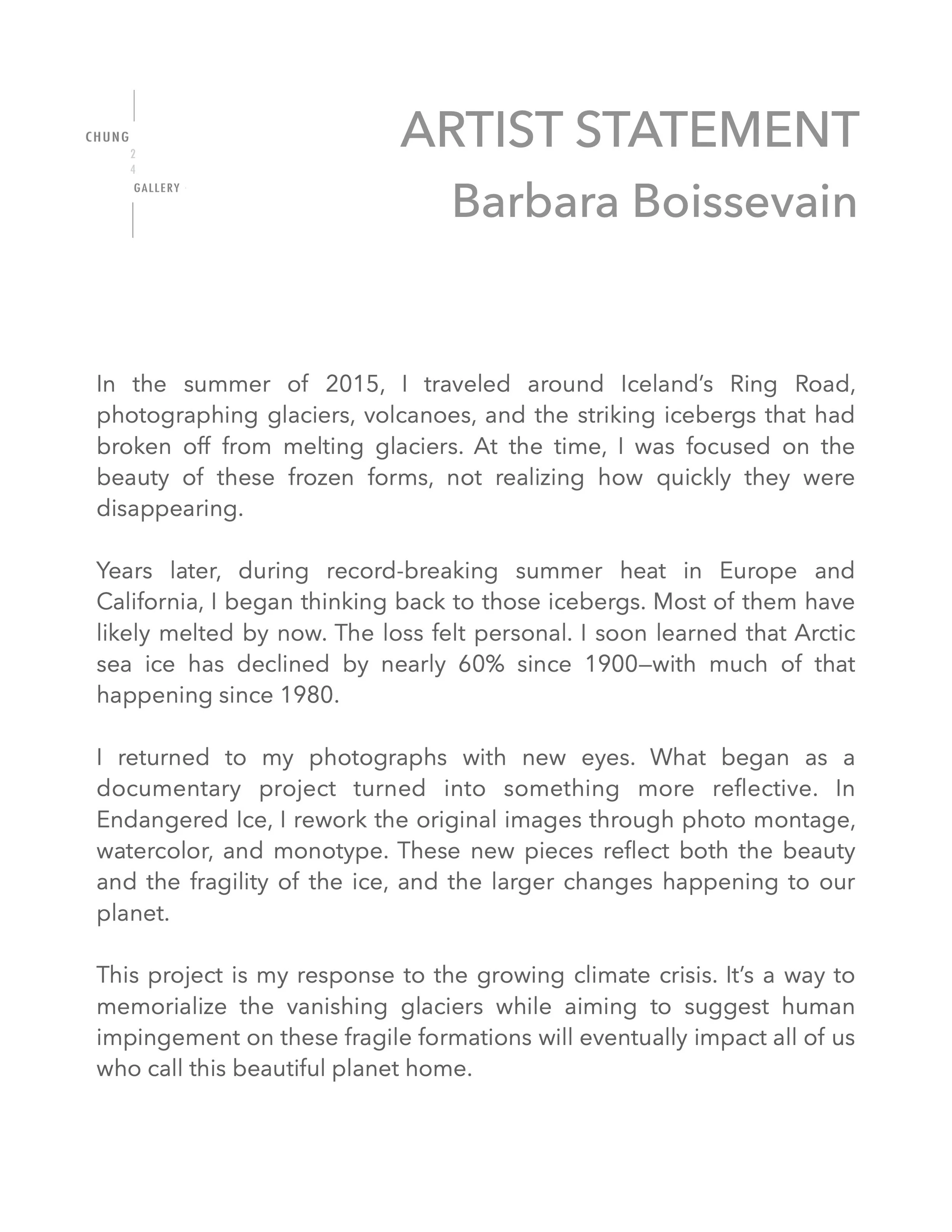 Barbara Boissevain, known for her body of work focusing on salt ponds, is debuting a new series combining photos and watercolor to depict the visually-imperceptible melting of glacier, the results are both breath-taking and heartbreaking. A multi-section photo sculpture is amongst the pieces showing for the first time.